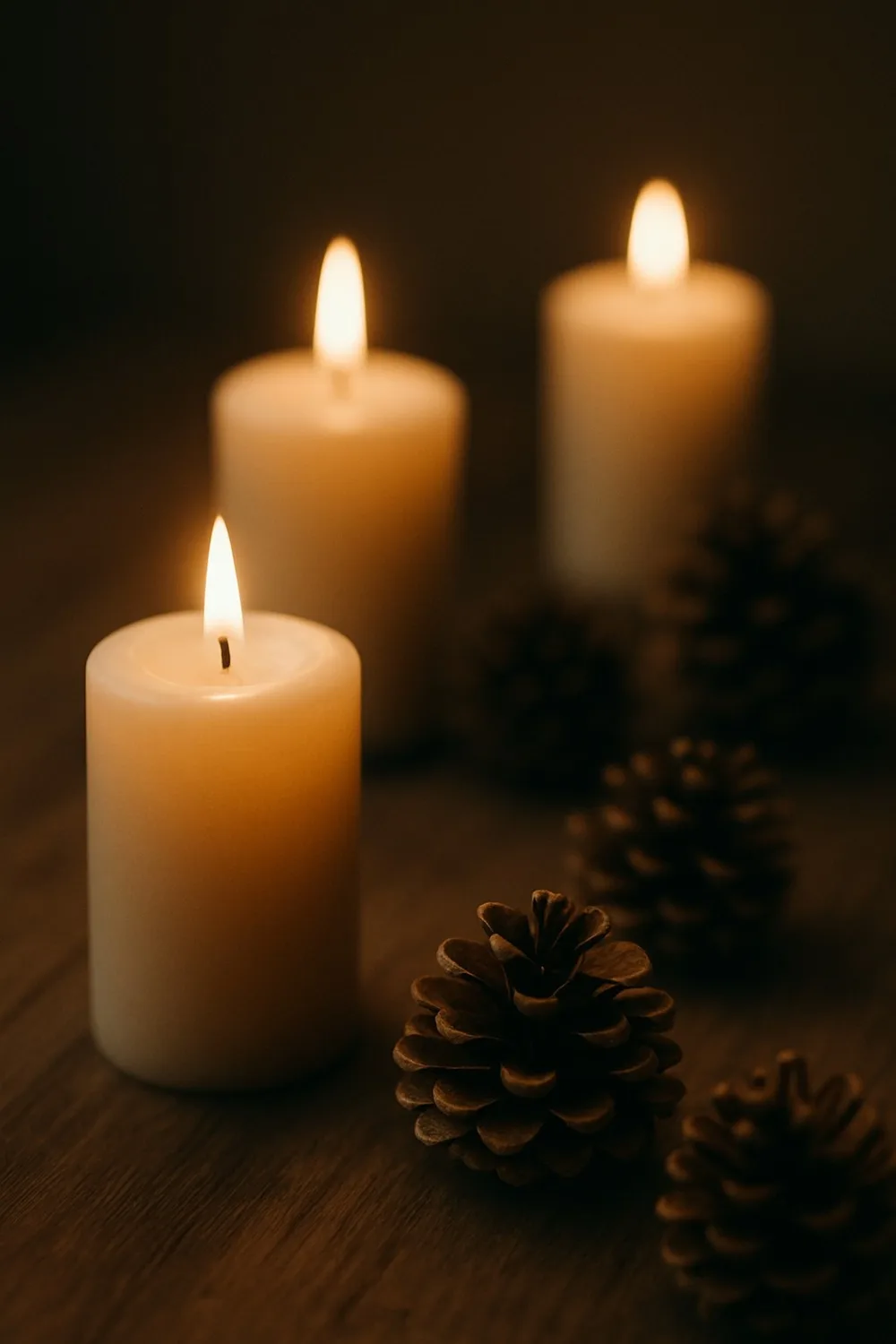 Foco suave em uma mesa com velas acesas e pinhas, sem mostrar toda a composição (ângulo lateral e sugestivo).